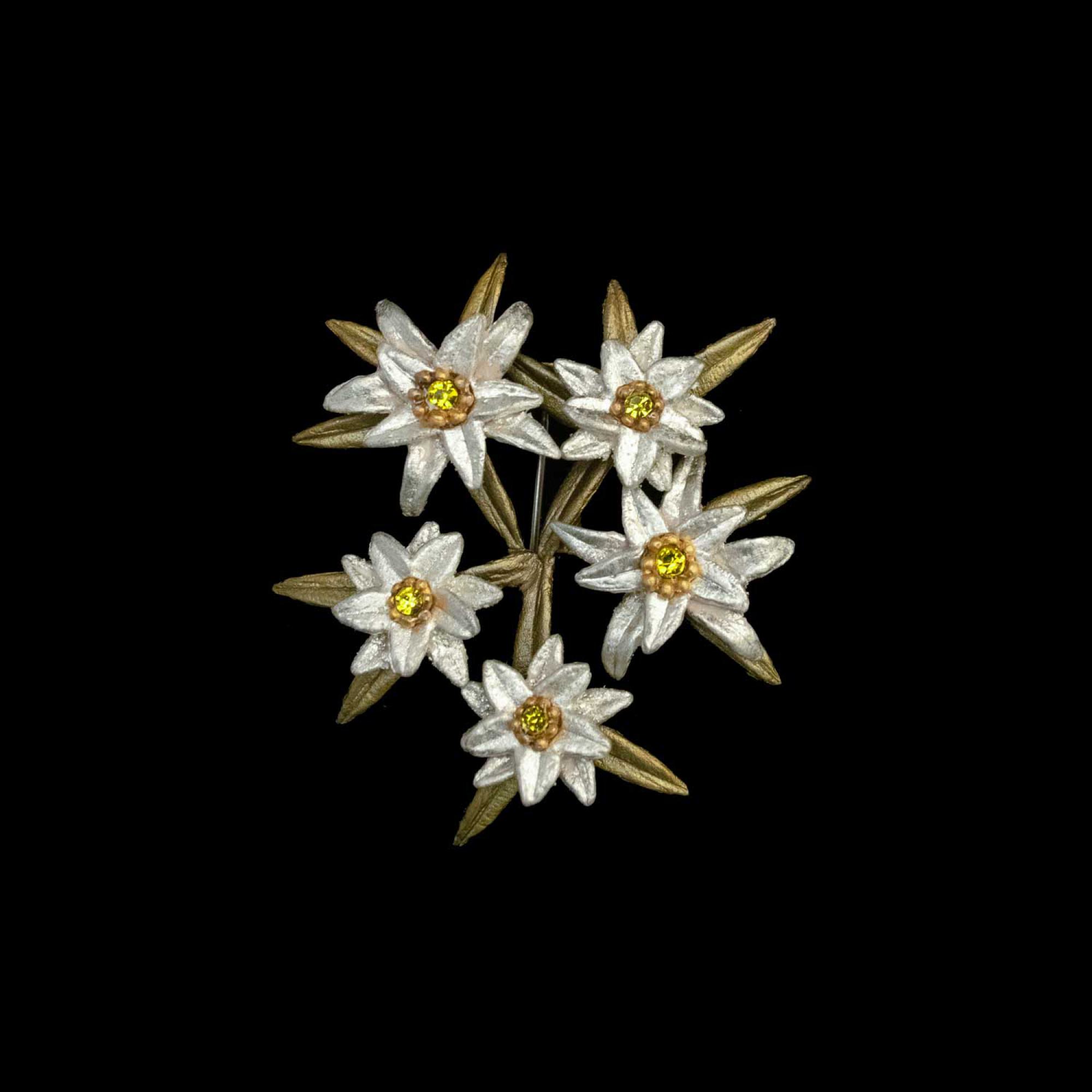 Material: Die Edelweiss Brosche ist aus Bronze gegossen, mit 22 Karat Weißgold-Blatt veredelt und mit einem österreichischen Kristall in einer Fassung aus 24 Karat Gold versehen. Die Haken bestehen aus 925er Silber mit einer 24 Karat Vergoldung.